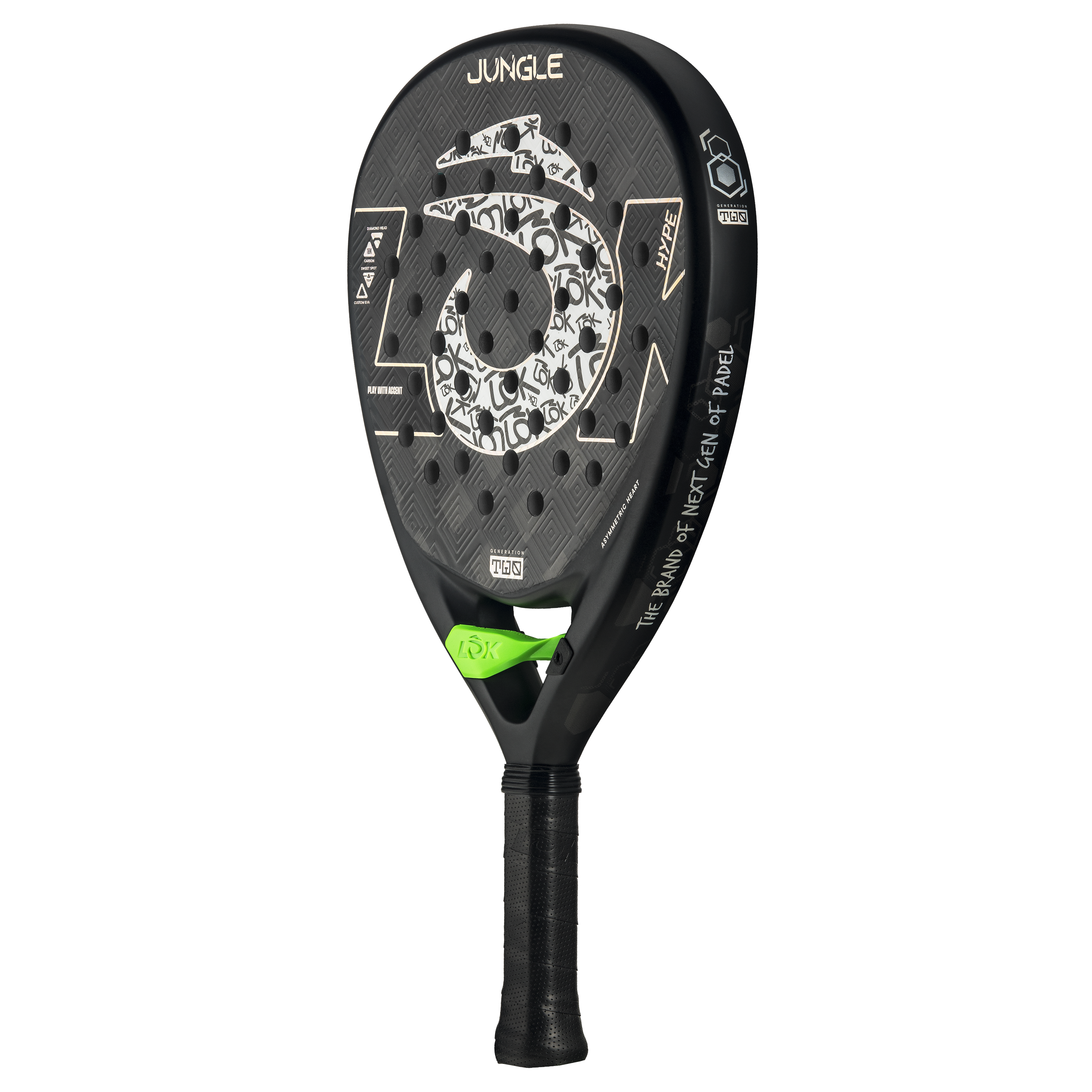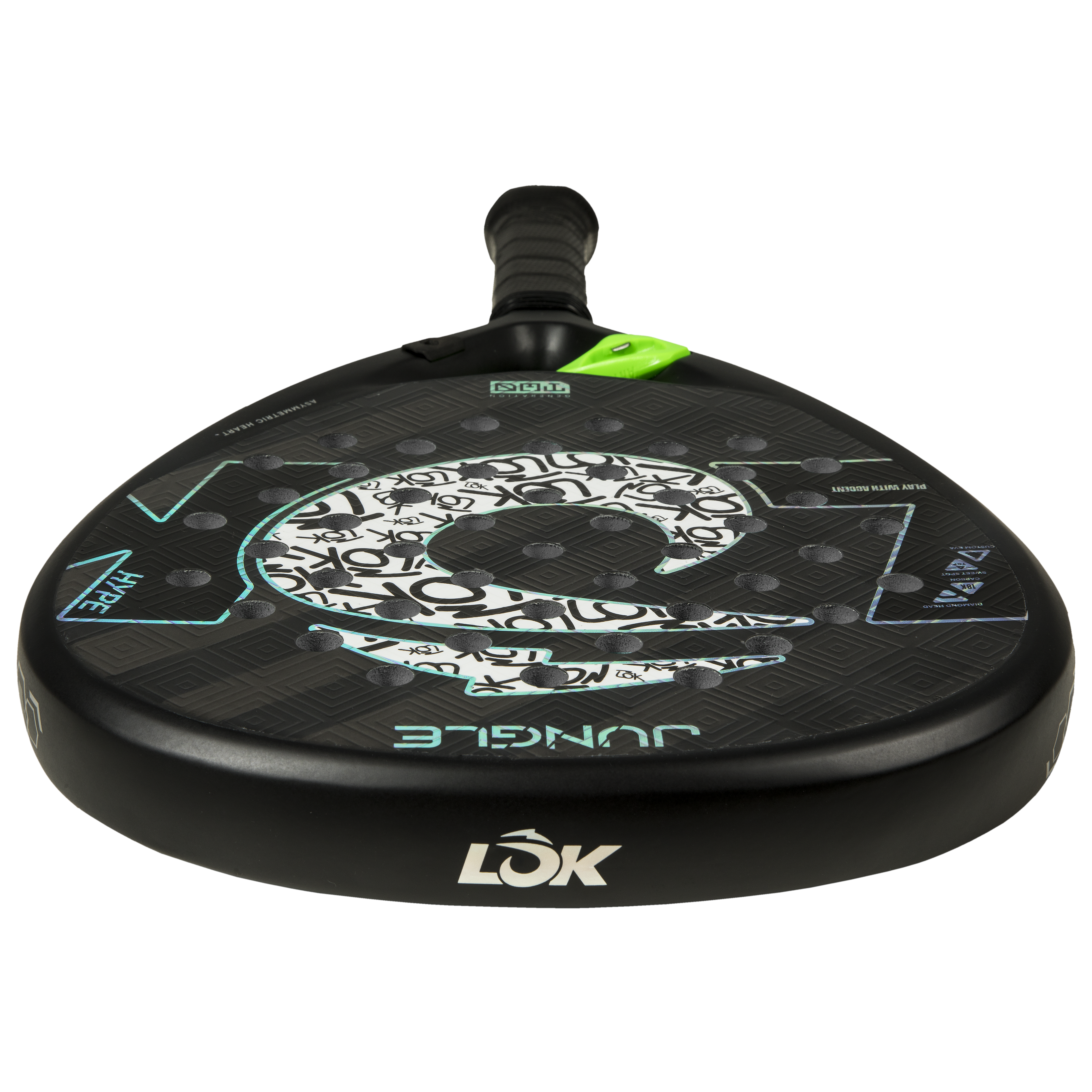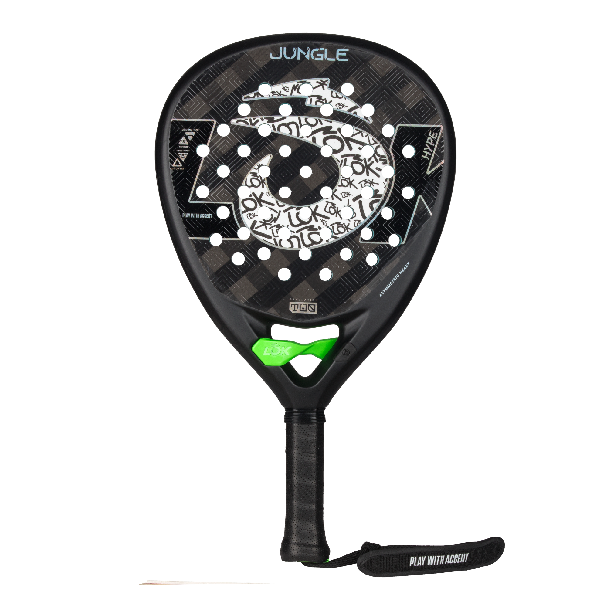 המחבט Jungle הוא המחבט שמשחרר את כל האנרגיה שלכם על המגרש. מחבט Asymmetric Heart EVO לא רק מחזק את המבנה כדי להעניק לכם יותר יציבות וקשיחות, הוא גם סופג ויברציות ומוסיף פרט ייחודי עם החלק המרכזי הירוק שלו, שאף ניתן להשתמש בו לפתיחת בקבוקים לאחר המשחק. חדשנות LOK טהורה על המגרש ומחוצה לו. פחמן C18 וגומי EVA עם זיכרון מכפילים את הכוח ומחזירים אנרגיה עם כל חבטה. מערכת קווי הסיבוב התלת-ממדיים מגבירה את הסיבוב והשליטה, בעוד שמערכת החורים הדינמית משפרת את תפוקת הכדור. עם חיזוקי פחמן המאריכים את תוחלת החיים שלו ורצועת יד נוחה לנוחות מרבית, מחבט Jungle משבש כוח, סגנון נועז וגישה פרועה. מחבט שנועד לשחקנים שאין להם גבולות.